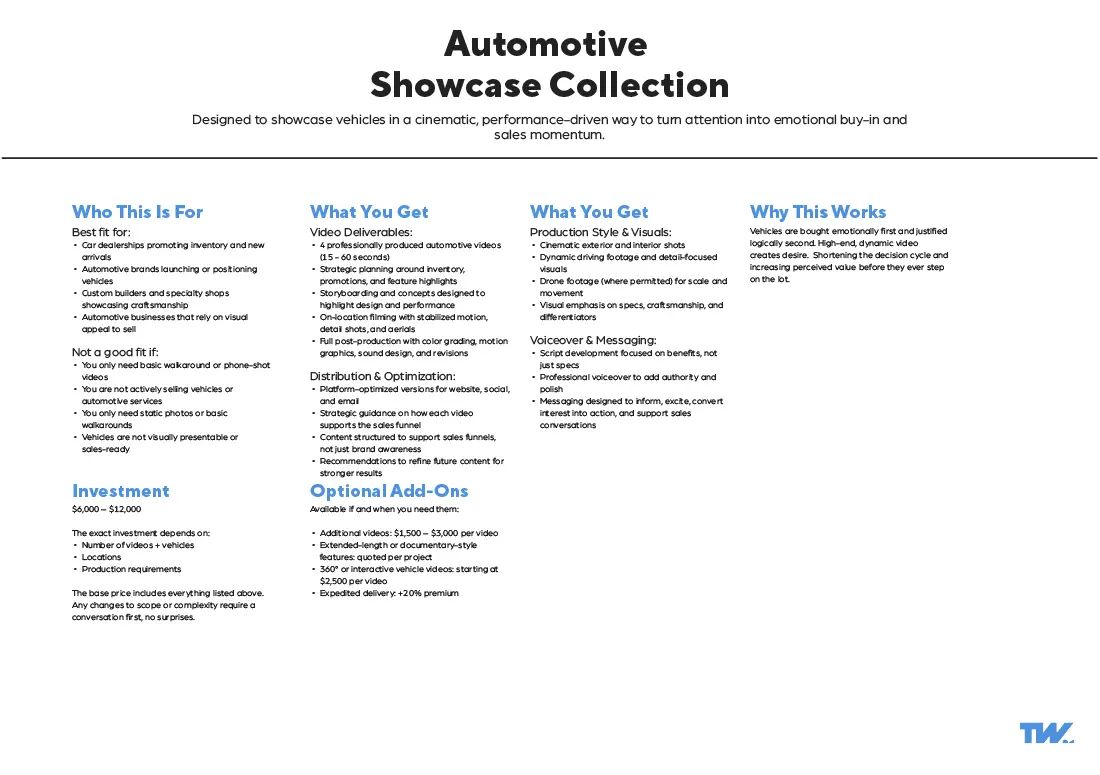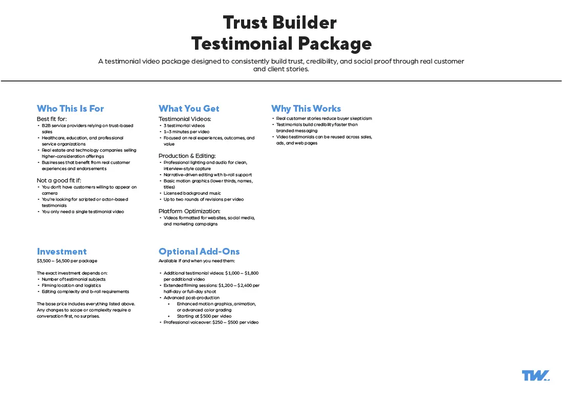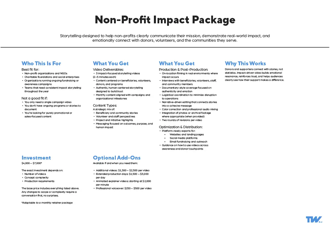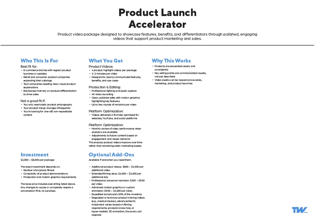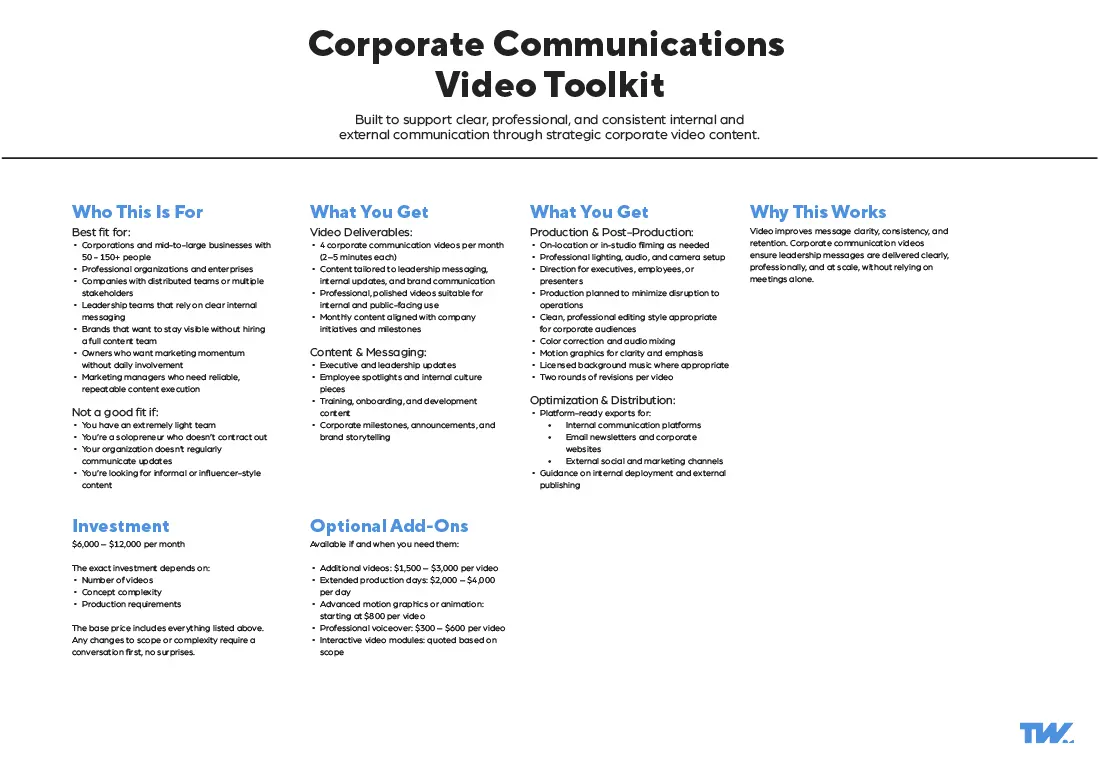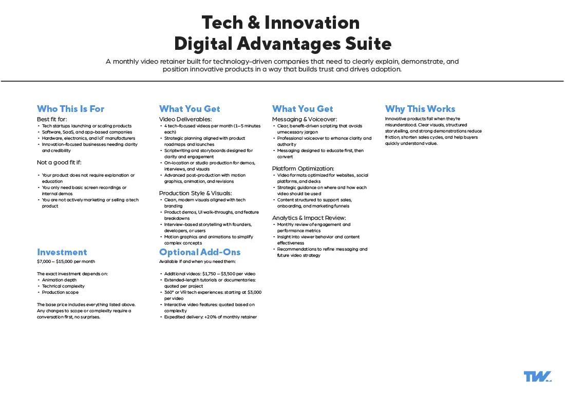 These video production packages are built from over a decade of commercial production experience across multiple industries. Refined into customizable (not custom) video production packages through real client outcomes and evolving communication needs.