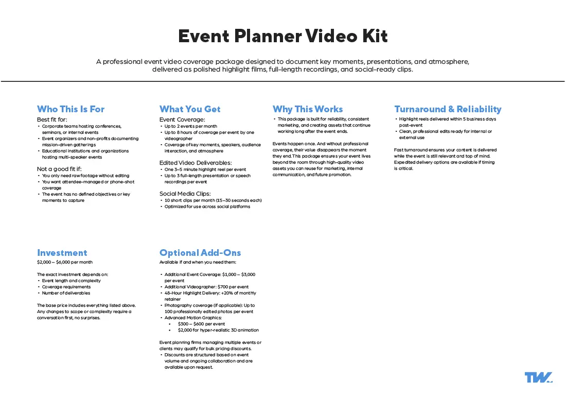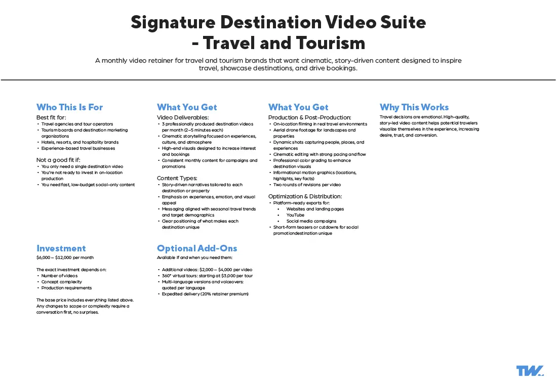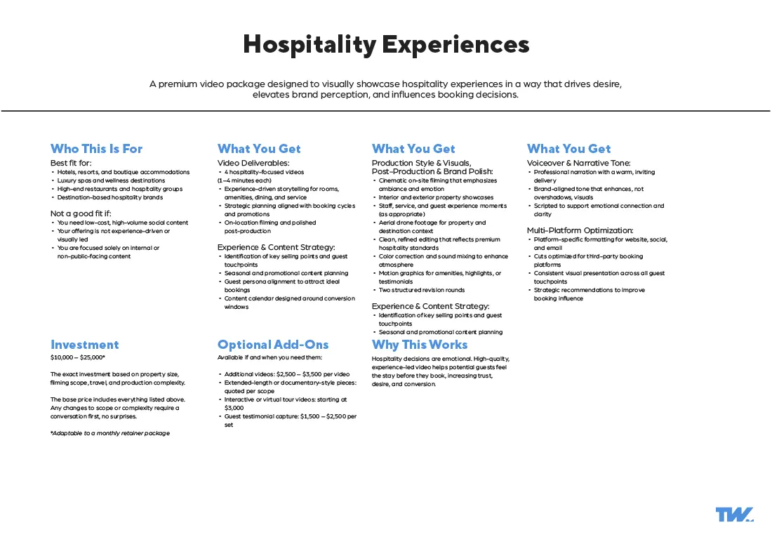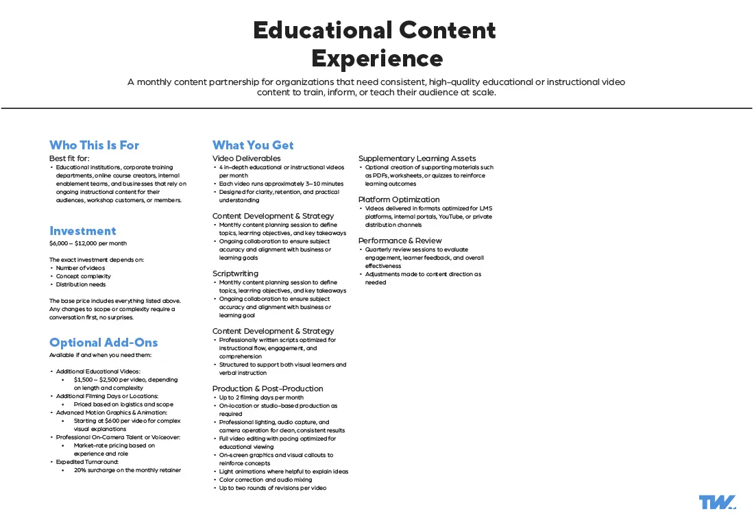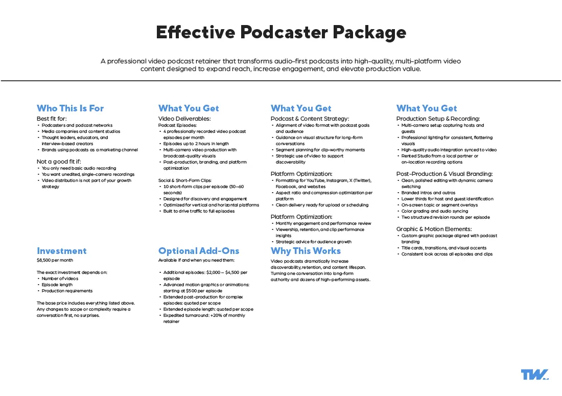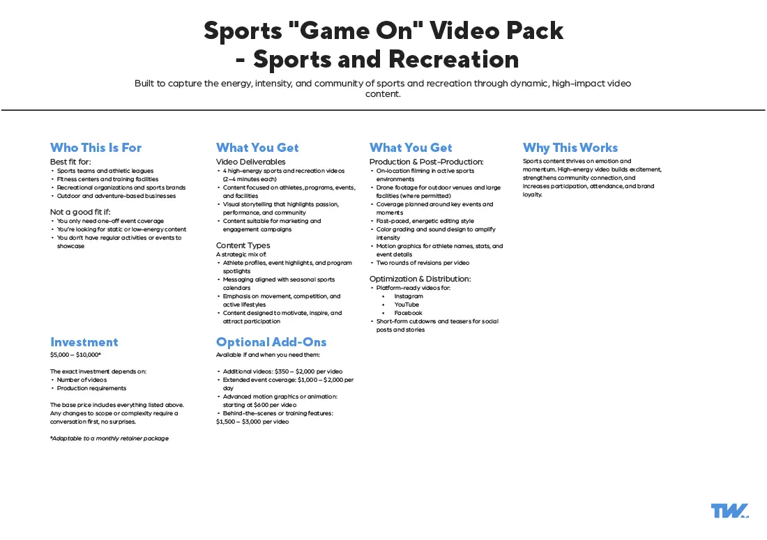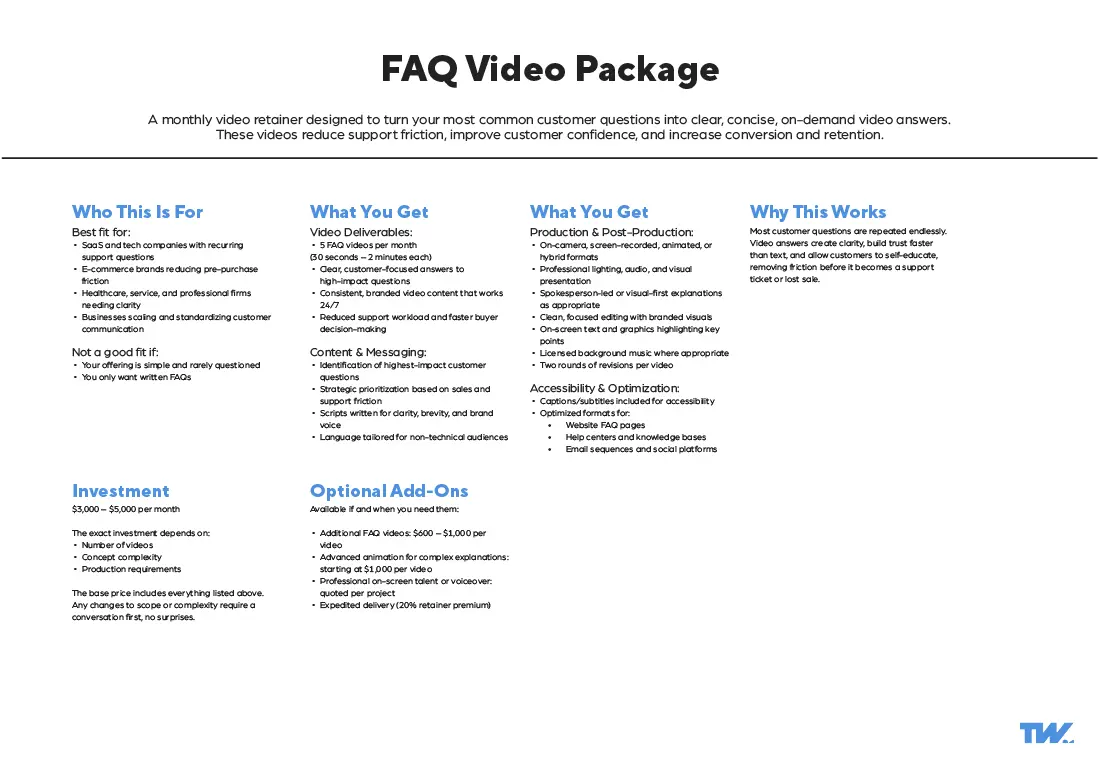 These video production packages are built from over a decade of commercial production experience across multiple industries. Refined into customizable (not custom) video production packages through real client outcomes and evolving communication needs.